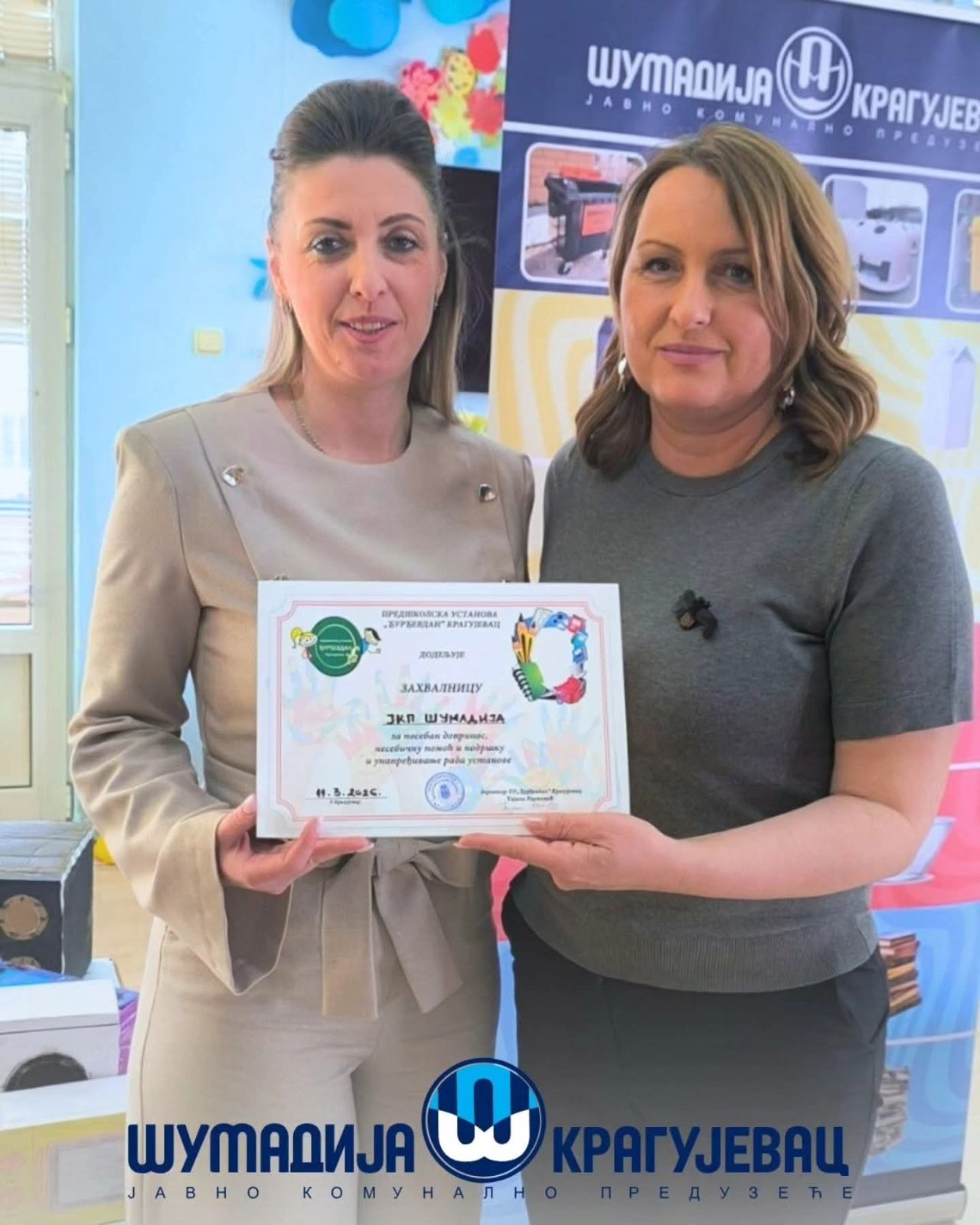 Захваљујемо се ЈКП Шумадија Крагујевац као пријатељима и партнерима што су препознали предшколце као најважнију карику у очувању здраве будућности, истакла је Тијана Ристовић, директорка ПУ „Ђурђевдан“ која је овом приликом и уручила представницима ЈКП Шумадија Крагујевац захвалницу за остварену сарадњу.